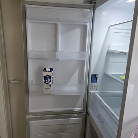 Samsung Side-by-Side køleskab med is- og vanddispenser. Køleskabet har flere hylder og dørarrangementer til opbevaring. Køleskabet har tydelige mærker/ridser på siden, men eller er det et fuldt funktionelt kølefryse skab.