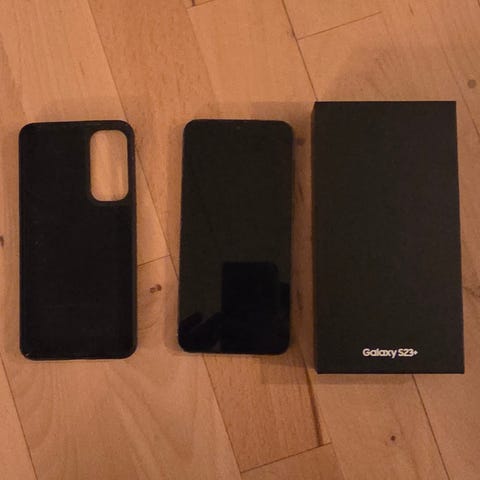 Samsung Galaxy S23 smartphone med 128 GB lagerplads. Enhedens model er Galaxy S23. Telefonen har en sort farve