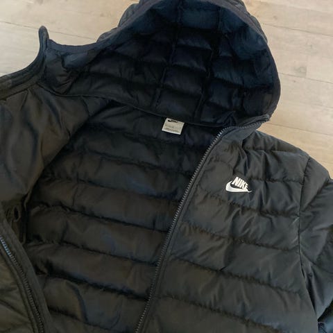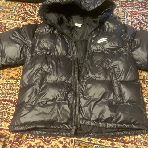 Nike Therma-FIT jakke i sort farve, designet til børn i størrelse 158. Jakken er fremstillet af dunmateriale og er egnet til både drenge og piger (unisex).