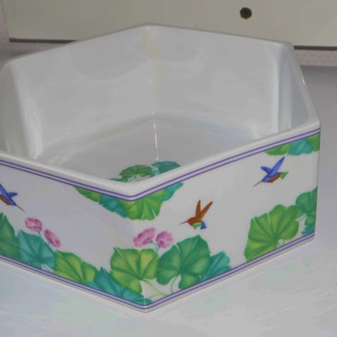 Sekskantet porcelæns skål med låg, låget kan også bruges som et lille fad. Fra serien ‘Colibri’ af Royal Copenhagen.