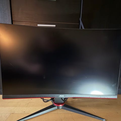 AOC 24" buet skærm med sort kabinet. Skærmen har en buet form, med en mere omsluttende visuel oplevelse. Velegnet til brug som computerskærm til arbejde eller underholdning. Model c24g1. Brugt minimalt. Nypris 2000,-
