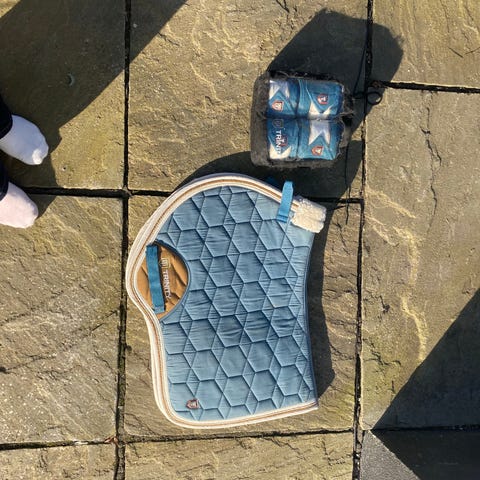 Trinity dressurunderlag i petroleum blå med lyserød kant.