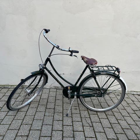 Klassisk kvalitetsdamecykel i blank sort med håndbygget stålstel, 7 indvendige Shimano Nexus gear, fodbremse og flot Brooks lædersadel.