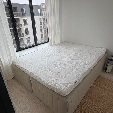 Super god boxmadras med ben i egetræ. Lidt brugt, derfor den billige pris. Kostede 7000,- for ny. Plads til opbevaring under. Ben 19cm.
