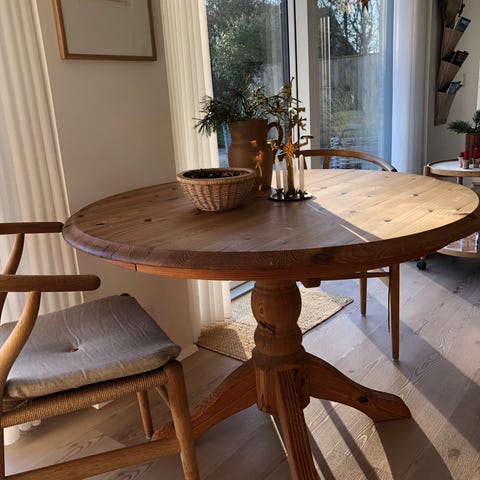 Smukt rundt Fyrretræsbord malet med blå linoliemaling