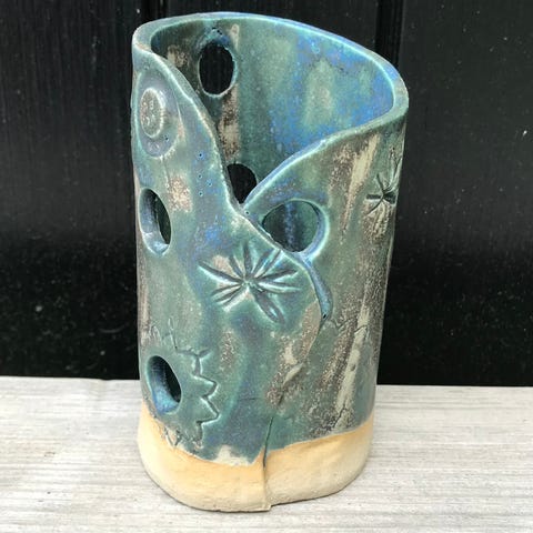 Smukkeste fyrfadsstage / lyslygte af keramik. Hånddekoreret med blomster og blade. H: 13,5 cm. Ø: ca 12 cm på det bredeste sted. Står i flot ubrugt stand. Fra franske Vallauris. Stemplet under bunden. Kr 295,-