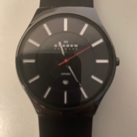 Skagen ur model 474XLSLC med dato viser og metalrem. Med batteri