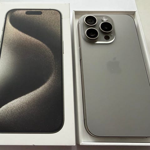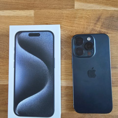iPhone 15 Pro 512gb i farven blå titanium og batterikapacitet på 90 %.