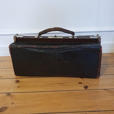 Rigtig flot ældre jordmodertaske / lægetaske i cognac farvet læder. Tasken i virkelig god stand, dog kunne messingen godt bruge en gang brasso.