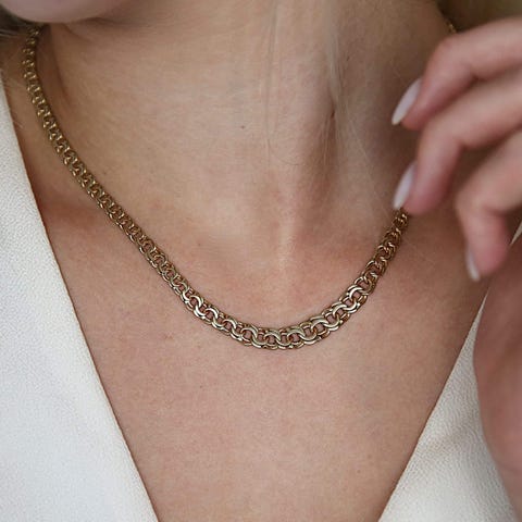 Bismark halskæde i 14 karat guld, udført i det klassiske dobbelte Bismark-design, der giver smykket et fyldigt, elegant og tidløst udtryk. Den tætte og fleksible kædestruktur gør halskæden både behagelig at bære og visuelt markant, samtidig med at guldet fremstår smukt og skinnende. Et perfekt valg til dig, der ønsker et smykke med både karakter og finesse.