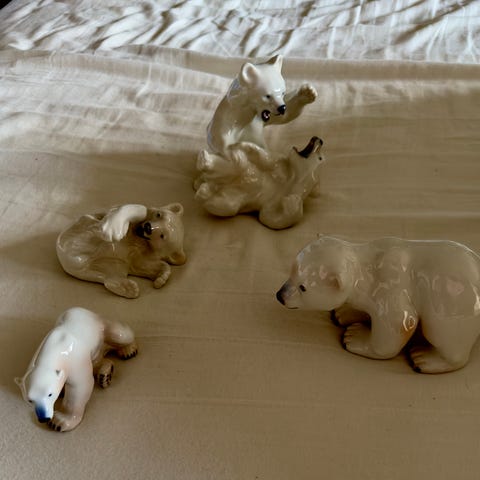 Sæt af porcelænsfigurer bestående af forskellige dyr herunder hunde i flere racer, fugle og en isbjørn. Figurerne er udført i porcelæn med detaljeret maling. Velegnet til samling eller dekoration.
