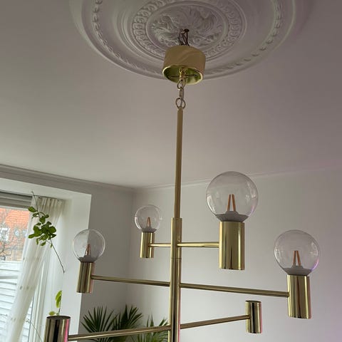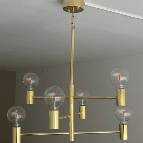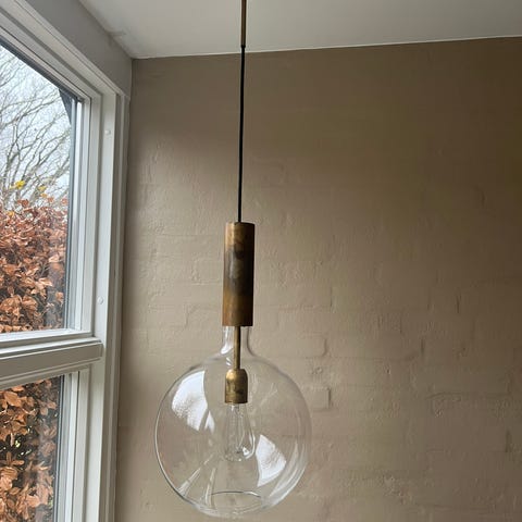 Strapatz pendel er en del af en lampeserie fra Konsthantverk, designet af Sabina Grubbeson. Lampen er fremstillet af messingrør. Den måler 65 cm i diameter og 96 cm i højden. Vi sælger den inklusiv fire LED-pærer fra Tala Voronei. Lampen koster 7.996 kr. fra ny og pærerne koster 660 kr. fra ny.