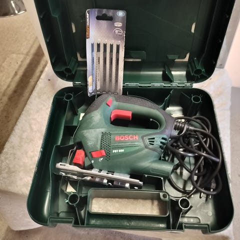 Bosch PST 800 PEL stiksav med tilbehør i kasse. Maskinen er testet og kører super godt. Nye klinger medfølger.