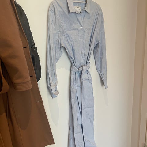 Mads Nørgaard jumpsuit til kvinder i størrelse 44. Jumpsuiten er blå og fremstillet i polyester. Den har kort ærme og lynlås i ryggen. Designet er løstsiddende med justerbar talje.