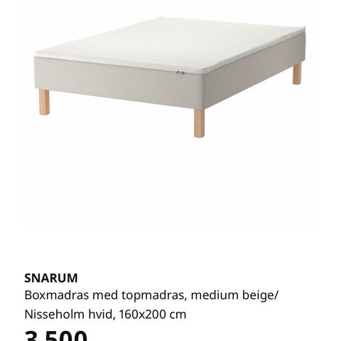 IKEA Snarum boxmadras med målene 160x200 cm. Madrasen har en fast opbygning og er designet til at passe til standard dobbeltsenge. Farven er grå. Sengen har stået i et hjem i tre dage, så købte jeg den men fandt den for stor sælges den nu videre.
