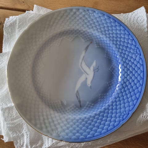 Den ene tallerken har et lille anslag.