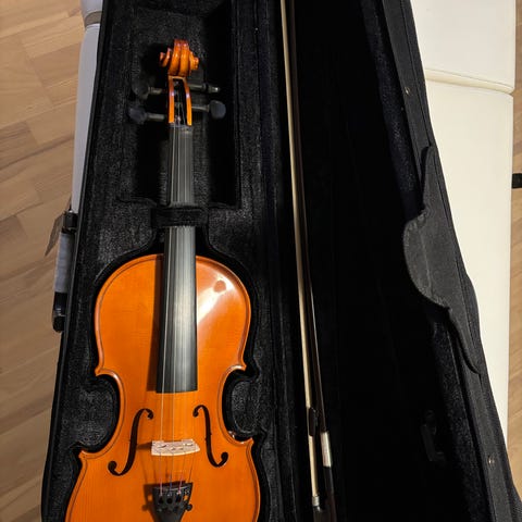 Violinen er opgraderet med et sæt bedre strenge. Der medfølger violin kasse og bue.