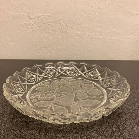 glasfad med blå farvetone. Fadet har en rund form med dekorative blå mønstre og er velegnet til servering eller dekoration.
