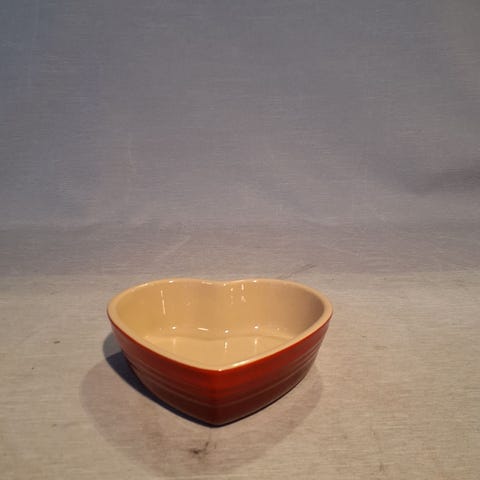 Skålen har hjerteform og glat overflade. Den er fremstillet af keramik og har en rød yderside.,Afhentes i:,Røde Kors Horsens (615),Bemærk at mail, chat og beskeder ikke besvares, og varen skal købes på knappen "Gå til varen"