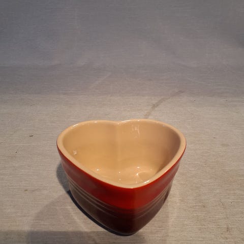 Skålen har en hjerteformet design med en glat overflade. Den er opdelt i en lyst beige inderside og en rød yderside med striber. Keramisk.,Afhentes i:,Røde Kors Horsens (615),Bemærk at mail, chat og beskeder ikke besvares, og varen skal købes på knappen "Gå til varen"