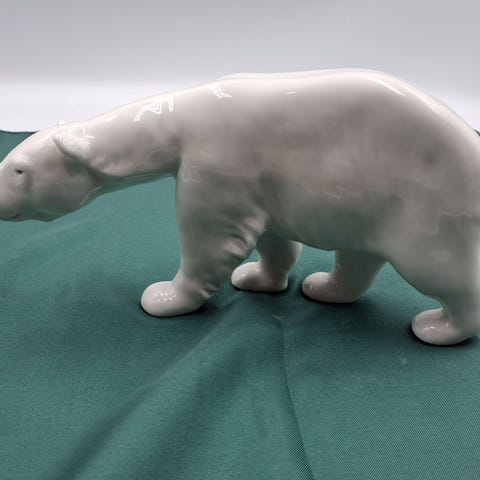 Produktet er en porcelænsskulptur af en isbjørn med glat overflade og detaljeret form.