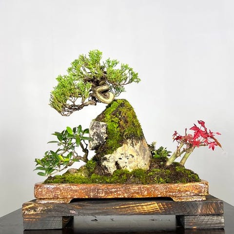 Til salg er en elegant Juniper bonsai (Juniperus) præsenteret i en raffineret landskabs-komposition på naturlig klippe, skabt i overensstemmelse med de æstetiske principper i traditionel japansk bonsai-kunst.