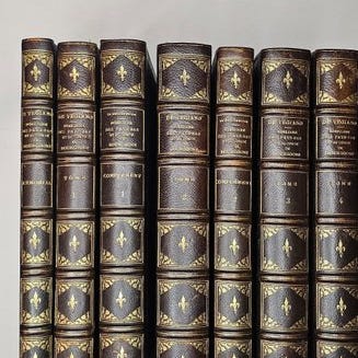 Nutidens leder bindinger (38x24cm; slidt); ex-libris E. Van Havre [Ernest van Havre fra Lille (Rijsel) (1819-1880)], brune blade.