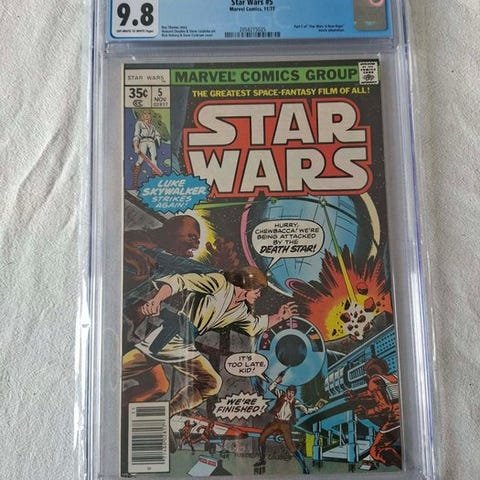 Star Wars første udgave, nr. 100, CGC 9.8 bedømt, mint tilstand, udgivet af Marvel Comics i 1985, med kunstnerne Tom Palmer, Cynthia Martin, Sam de la Rosa og Mary Jo Duffy, hæftet binding, én genstand. Klik på den blå "gå til varen" knap, for at købe eller byde på denne vare. Den samlede pris vil blive vist inden du afgiver dit bud.