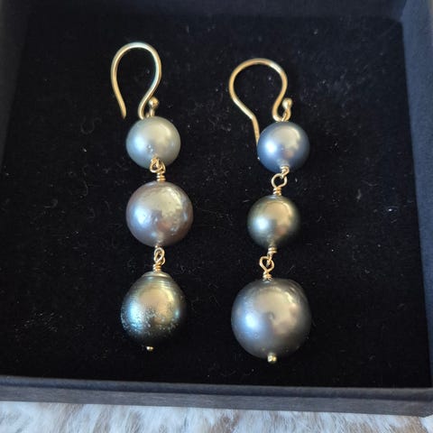 Den hvide Akoya-perle måler 6x6,5 mm i diameter og sidder på øreflippen, mens de grønne Tahitian-dråber måler 9x9,5 mm og hænger ned under øreflippen.
