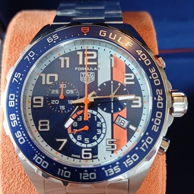Tag Heuer Formula 1 Aston Martin Red Bull Racing CAZ101AK, kvarts kronograf med 43 mm stålurkasse, blå skærm, stålrem over 200 mm, vandtæt til 200 m, ny med komplet sæt inklusive originalboks, papirer og garanti. Klik på den blå "gå til varen" knap, for at købe eller byde på denne vare. Den samlede pris vil blive vist inden du afgiver dit bud.