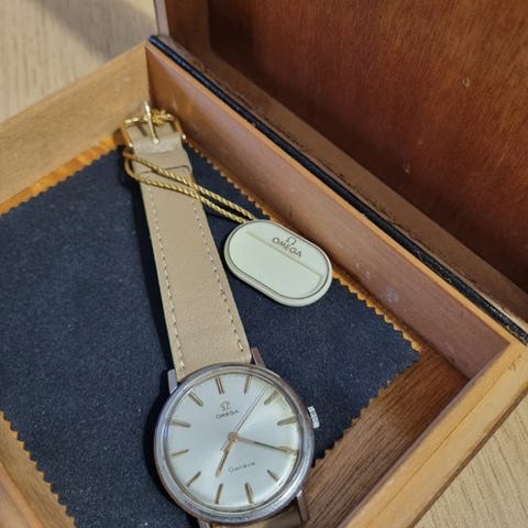 Omega Geneve Automatic 166.041 vintages herrearmbåndsur med guldpladeret rustfrit stål, 34 mm, automatisk bevæget Calibre 565, gyldent skær og lang læderrem, i god stand med synlige brugsspor. Klik på den blå "gå til varen" knap, for at købe eller byde på denne vare. Den samlede pris vil blive vist inden du afgiver dit bud.