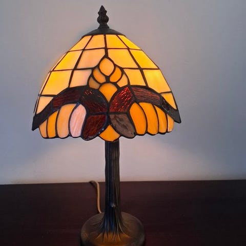 En meget smuk Tiffany-lampe. Meget flot designet, lavet af kvalitetsmaterialer. Messing og glas i stald. Meget smuk farverig kuppel. Farverigt glas i stald-lampehoved og solid messingfod. Et meget smukt stykke til dit interiør.
