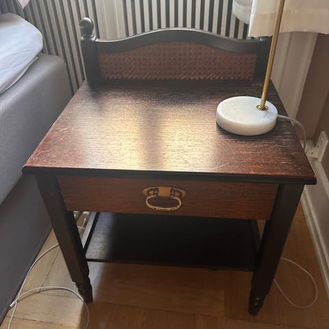 Natborde har formede kanter og buede ben; skabsdøren åbner sig for at afsløre et opbevaringsrum med en hylde indeni. Håndtagene er lavet af harpiks og