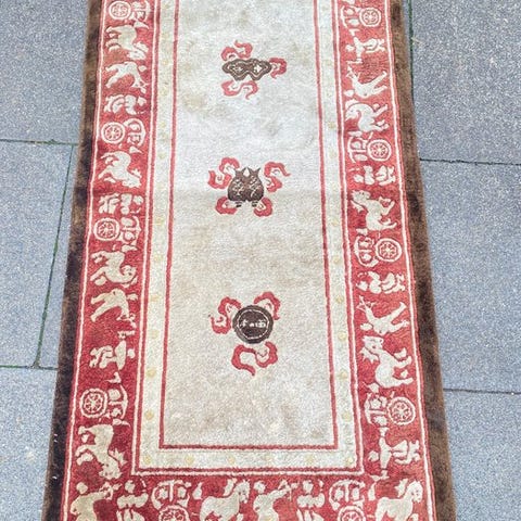 Hånd-knyttet orientalsk tæppe fra Guangzhou, uld på bomuld, 317 × 212 cm, lilla og hvid, slutningen af det 20. århundrede, i meget god stand, professionelt renset, uden medaillon og med græsk mønstret kant, certifikat medfølger. Klik på den blå "gå til varen" knap, for at købe eller byde på denne vare. Den samlede pris vil blive vist inden du afgiver dit bud.