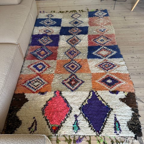 Oprindelse: Marokko; Model: Marokko; Størrelse: 210 cm x 127 cm; Materiale: uld på bomuld; Produktionsperiode: slutningen af 1900-tallet; Tilstand: i meget god stand. Klik på den blå "gå til varen" knap, for at købe eller byde på denne vare. Den samlede pris vil blive vist inden du afgiver dit bud.