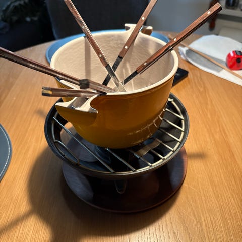 Fondue-sæt i emaljeret støbejern, fremstillet i Frankrig af 'Le Creuset', i originalemballage.