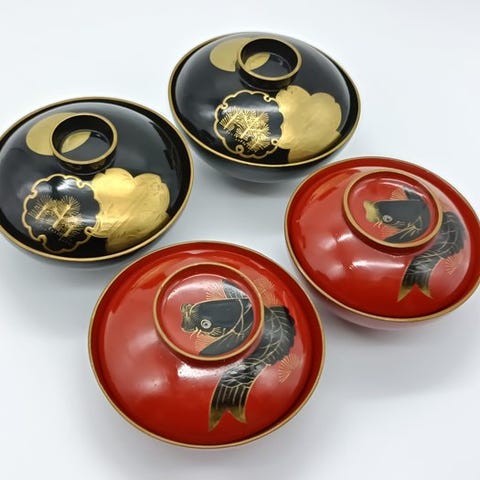 Dette er et sæt på fem lågede suppeskåle fremstillet i Wajima-lakværk, betragtet som den højeste standard inden for japansk lakkunst.
