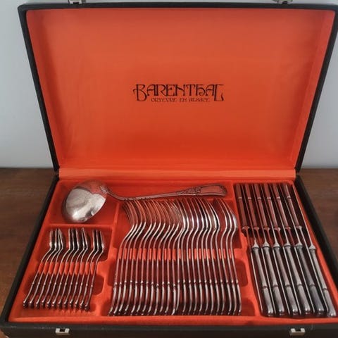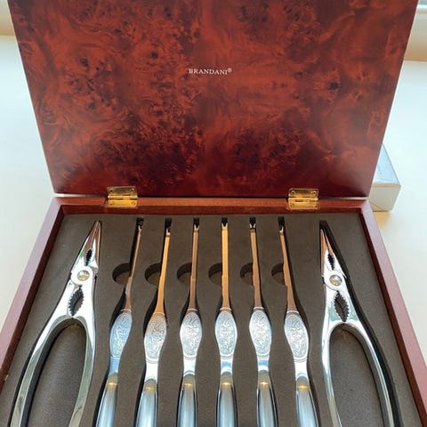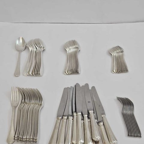 Servise af rustfrit stål fra Broggi.. 6 personer .. 6 gafler, 6 skeer, 6 små gafler, 6 teskeer, 6 knive og 2 store dessertbestik.. nye, aldrig brugt, stadig pakket ind... vægt og mål er angivet i de detaljerede billeder, der er en del af beskrivelsen... vil blive omhyggeligt pakket og sendt med sporbar levering...