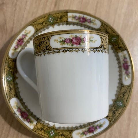 6 kaffekopper og deres 6 underskåle forgyldte med fint guld (må ikke sættes i mikrobølgeovnen for at varme kaffen op!...) i Limoges kunstporcelæn (Frankrig) - Maison Légle