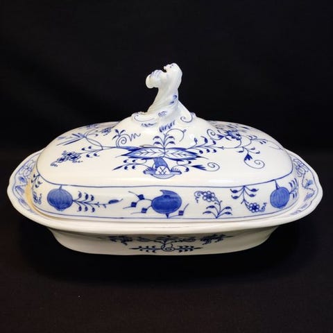 Særpræg: håndmalet underglasur, dekor Løgemønster bliver i øjeblikket igen tilgængelig til salg hos Meissen (denne skål er i øjeblikket ikke til salg hos Meissen, der tilbydes i øjeblikket kun firkantede skåle 21x21x7 cm for 489,00 € hver)