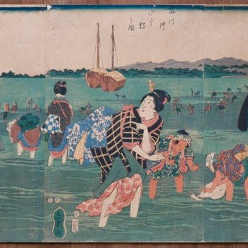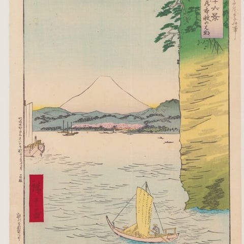 Utagawa Hiroshige 歌川 広重 (1797 – 12. oktober 1858) var en japansk Ukiyo-e-kunstner og betragtes som den sidste store mester i den tradition. Hiroshige er bedst kendt for sin liggende landskabsserie The Fifty-three Stations of the Tōkaidō og for sin stående/vertikale landskabsserie One Hundred Famous Views of Edo. Motiverne i hans værker var atypiske for ukiyo-e-genren, hvis typiske fokus var på smukke kvinder, populære skuespillere og andre scener fra byens fornøjelser i Japans Edo-periode (1603–1868). Kodama Matashichi var en Meiji-periode-udgiver af ukiyo-e med