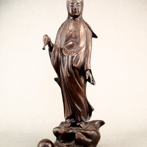 Træstøbninger af Hōnen Shōnin og Zendō Daishi indelukket i et japansk shrine; Hōnen Shōnin er 18,6 cm høj, 12,3 × 9,3 cm; Zendō Daishi 19,1 cm høj, 12,5 × 9,3 cm; shrine måler 31,4 × 33,5 × 15,5 cm; samlet vægt 1570 g; tilstand præget af alder og en brudt venstre dør. Klik på den blå "gå til varen" knap, for at købe eller byde på denne vare. Den samlede pris vil blive vist inden du afgiver dit bud.