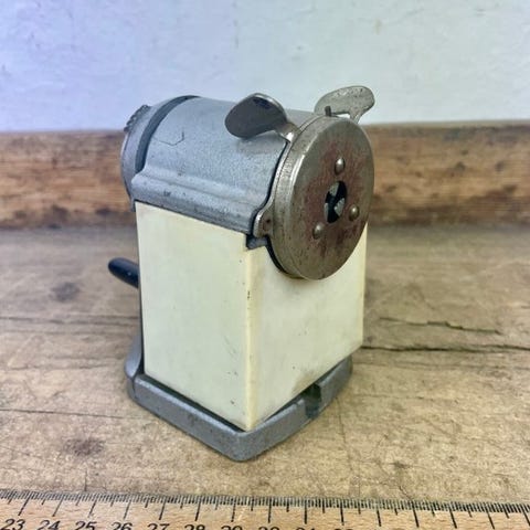 Vintage blyantspidser fra USSR, model ШПР-164, med fuldt metalisk indre og bund, ydre plast/beige hus, mål 12 cm høj, 7 cm bred og 11 cm dyb, i god brugt stand. Klik på den blå "gå til varen" knap, for at købe eller byde på denne vare. Den samlede pris vil blive vist inden du afgiver dit bud.