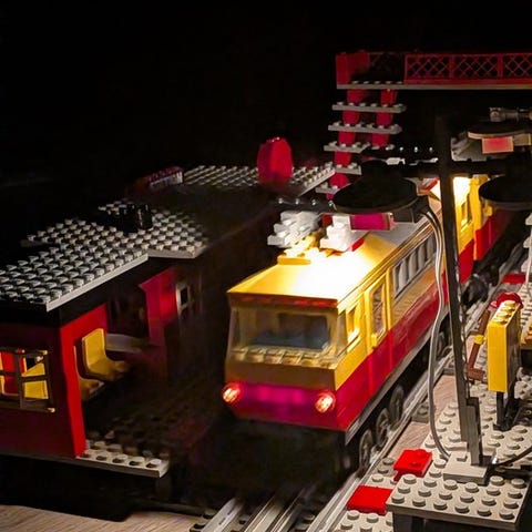 LEGO 7740 er den 'Inter-City Passenger Train', en ikonisk 12-volts elektrisk passagertogset fra 1980, kendt for sin røde og gule lokomotiv med lys, to vogne, perron, skinner og minifigurer, en klassiker fra LEGO's tidlige tog-æra.