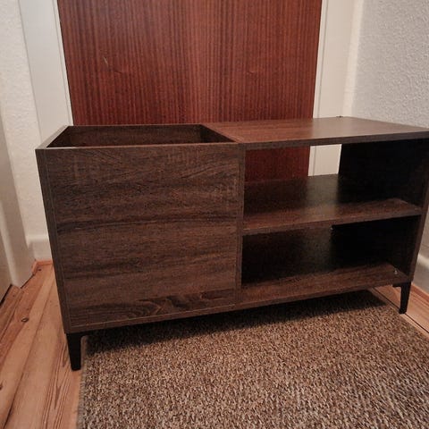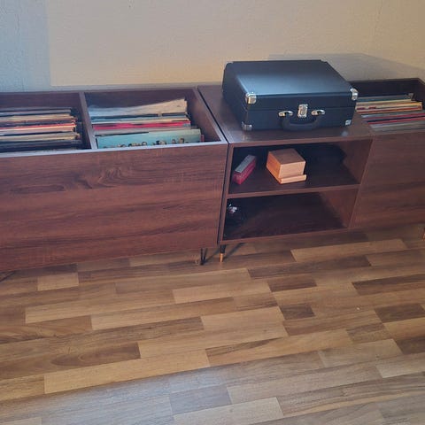 Cool møbel som passer til pladespiller samt vinyler i bunden. Møblet er malet med en grå beige maling fra mærket Vintage Paint.