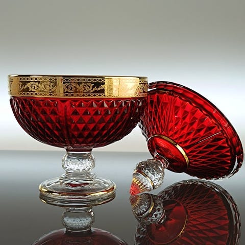 Sødskål lavet med orange emalje og guld på forgyldt glas.