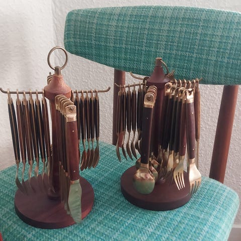 Smukt sæt med 10 krystal Art Deco-knivholdere i originalæsken. Holdene har en let opadgående, vinklet midtersektion og facetterede, spidse ender. Undersiden er facetteret hele vejen rundt om kanten. Fremstillet omkring 1930.