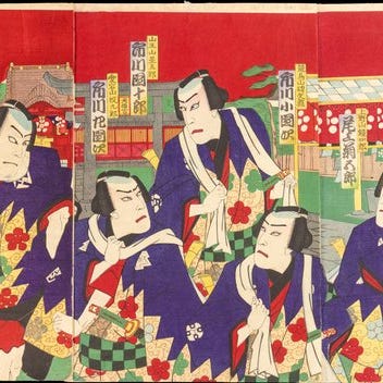 Ōkubi-e-portrætter af Kabuki-skuespillere iført modebetonet Meiji-periode-beklædning, der blander moderne Meiji-æstetik med traditionel Kabuki-stil.