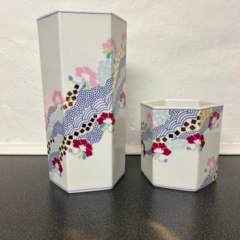 Bing & Grøndahl sekskantet vase i porcelæn med dekorative mønstre i forskellige farver. Vasen har en unik form og er mærket med Bing & Grøndahl logo og designsignatur. Velegnet til dekoration og opbevaring af blomster.