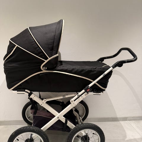 Lækker odder barnevogn.Skøn vogn med lufthjul for god affjedring. Stort liggemål vogn indvendig 97 cm. Madras 93 cm. Ingen fugt altid stået inde når den ikke blev brugt. Overlæder med lynlås i midt. Letvægt stel nem at klappe sammen. Den gode bremse der kan låses uden at løfte vognen.Justerbart styr. indkøbskurv. Medfølger orginal odder sele, isolerings madrads, tyk lækker madrads fra aero sleep, odder regnslag, myggenet fra Gaia og ko. odder lift med god madrads dog uden kaleche og overlæder kan medfølge hvis ønskes